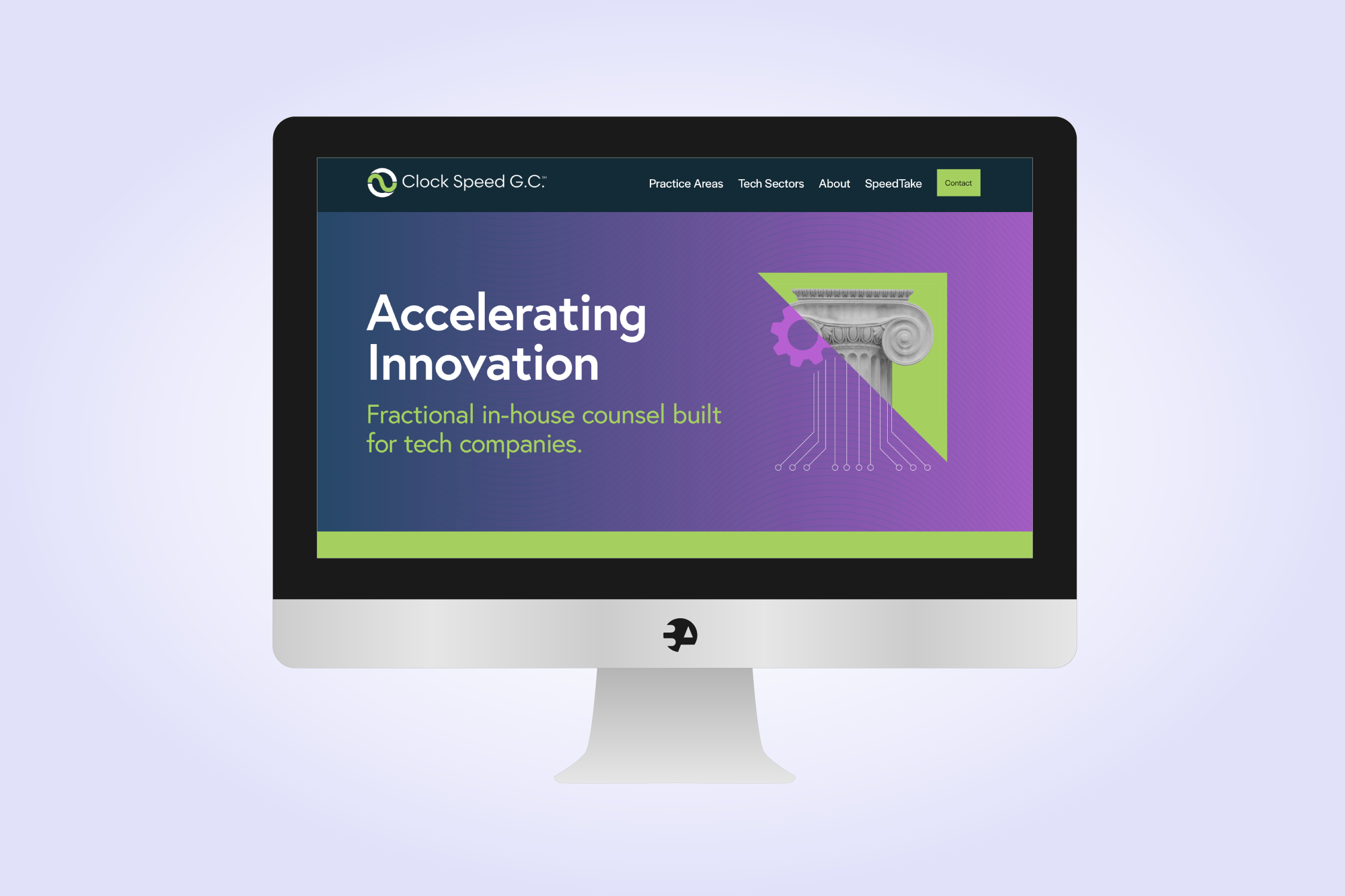 ClockSpeed, G.C. specializes in providing in-house counsel to tech companies. The logo and site are designed to feel more innovative and modern than a traditional firm to speak to a tech-focused audience.